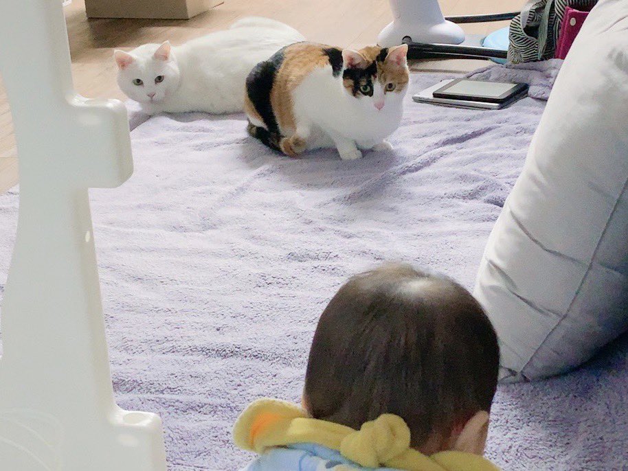 이 사진을 찍을 때에 꼬꼬마는 정말 아기여서 제대로 기어 다니지도 못할 때였다. 그래서 저 작은 인간이 무얼 하나, 고양이들이 매일 바라보곤 했다. 꼬꼬마가 더 아기일 때는 힘 조절도 안돼서 마시랑 마요나 털을 쥐어뜯곤 했는데, 아기라도 화내지 않고 그저 나를 보았다. 인간, 작은 인간 좀 어떻게 해봐! 하는 눈빛으로. 이제는 꼬꼬마도 살살 예쁘다~ 하고 쓰다듬을 줄 아는 조금 큰 아기가 되었다. 만날 마시 이쁘다(하게) 해줘요! 그런다.